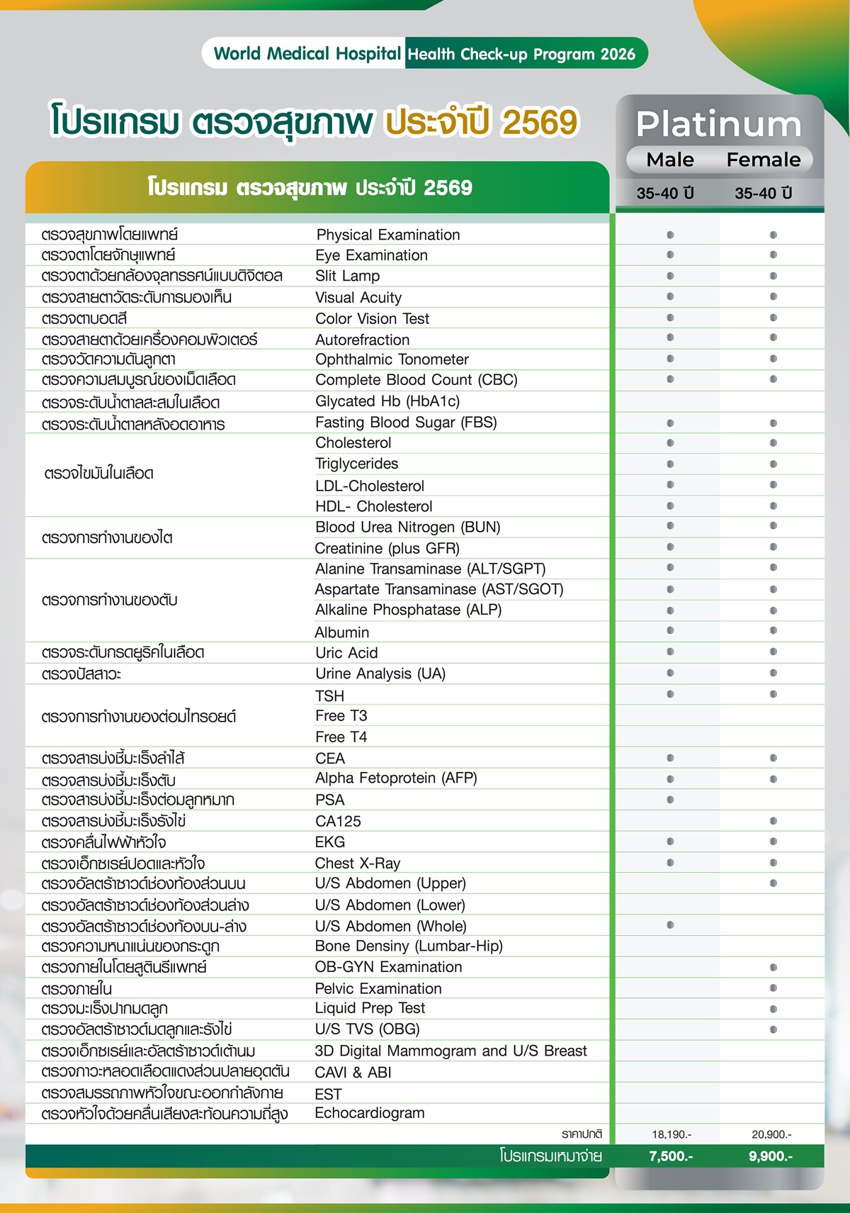 ● โปรแกรม Platinum : ผู้ชาย สำหรับผู้อายุ 35-40 ปี ราคา 7,500 บาท