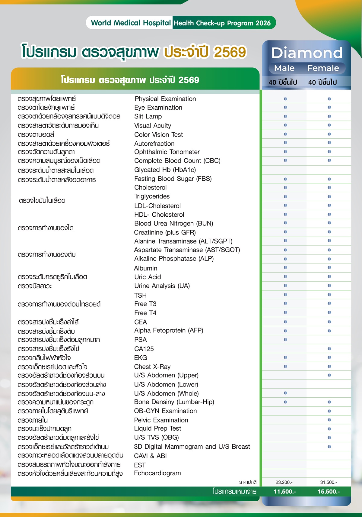 ● โปรแกรม Diamond : ผู้หญิง สำหรับผู้อายุ 40 ปีขึ้นไป ราคา 15,500 บาท