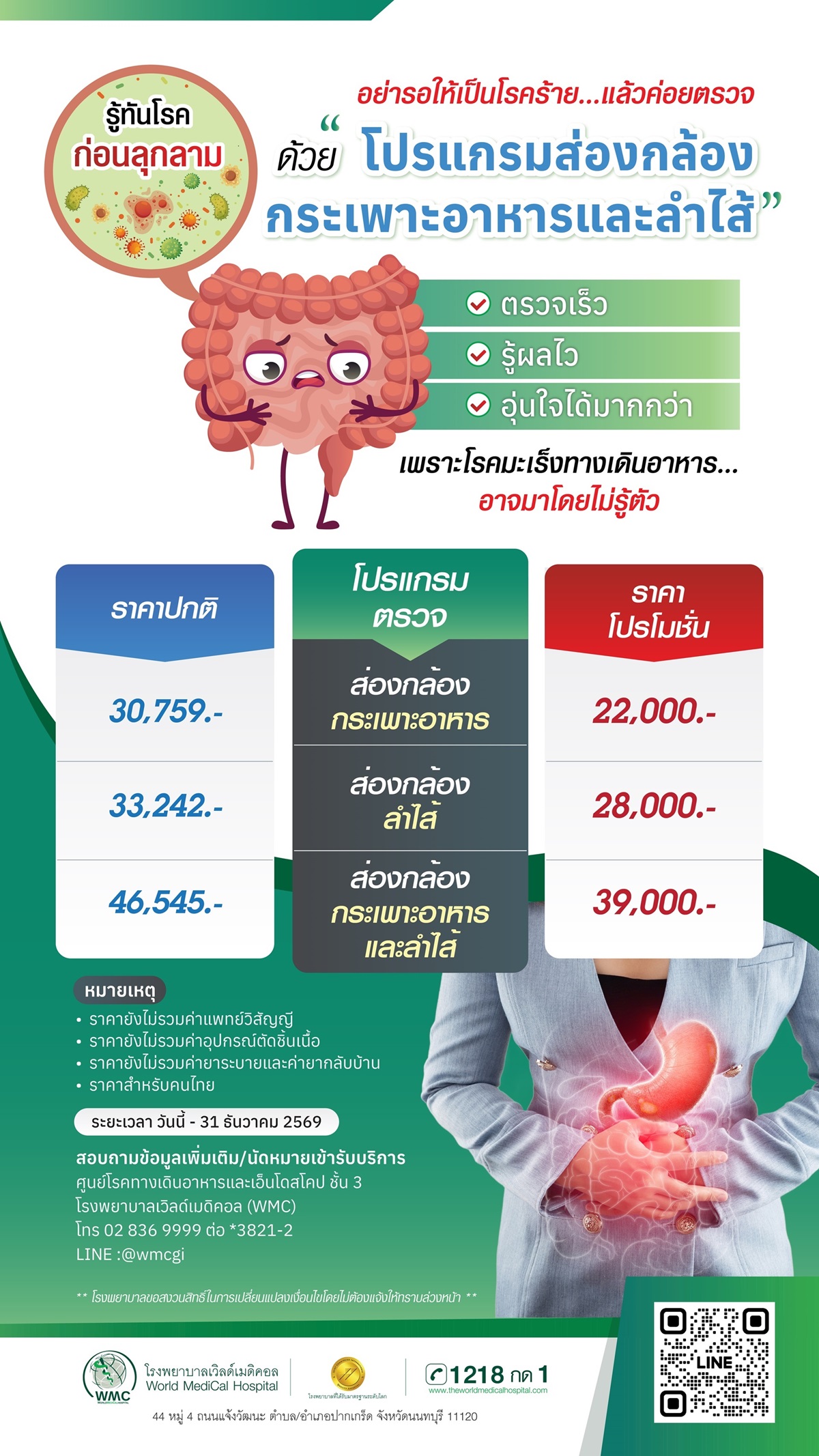โปรแกรมส่องกล้องกระเพาะอาหารและลำไส้ ราคา 39,000 บาท (ราคาปกติ 46,545 บาท)